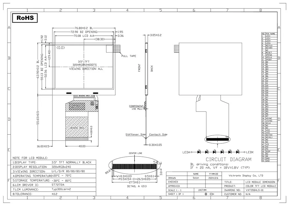 Is cineál taispeána criostail leachtach é TFT LCD a úsáideann teicneolaíocht trasraitheora tanaí-scannáin chun caighdeán na híomhá a fheabhsú, agus tá go leor feidhmeanna ann sa saol laethúil. Mar mhonaróir agus soláthróir modúl gairmiúil TFT sa tSín, cad a dhéanann modúl TFT Victronix 3.5 orlach 320 × 240 QVGA IPS ó mhonaróirí eile? Ar an gcéad dul síos, cuireann sé gile tipiciúil de 300 CD/m², uillinneacha féachana 80 ° leathan i ngach treo, agus cóimheas codarsnachta de 800: 1, ag cinntiú inléiteachta den scoth ó uillinneacha éagsúla. Ar an dara dul síos, comhtháthaíonn sé aonad cúl -sholas ag baint úsáide as 6s soilse bána le saolré tipiciúil de 30,000 go 50,000 uair an chloig (go gile tosaigh 50%), ag cinntiú infheictheachta soiléir i ngach coinníoll soilsithe. Thairis sin, tacaíonn sé le comhéadan RGB 24-giotán leis an rialtóir ST7272A. Ina theannta sin, téann sé thar thástáil chomhshaoil dian, lena n-áirítear turraing theirmeach (-30 ° C ↔ +80 ° C timthriallta), stóráil taise (60 ° C/90% RH), agus creathadh meicniúil, ag cinntiú gur féidir leis oibriú gan uaim thar raon teochta sínte (-20 ° C go +70 ° C).