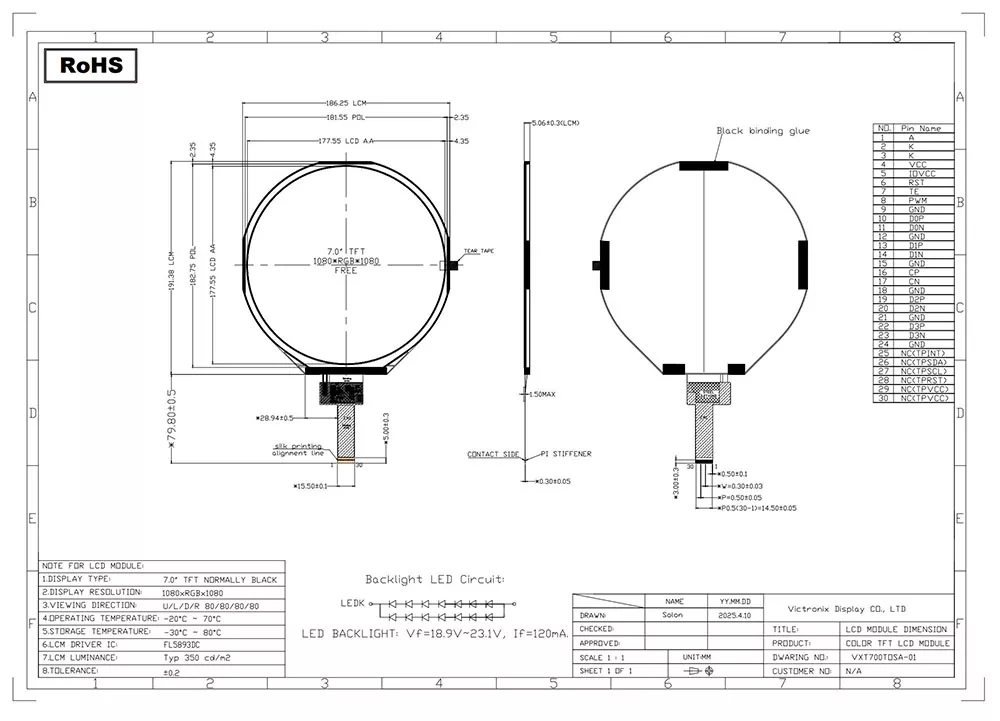 Is féidir modúl TFT a fháil i ngach áit sa saol. Cad a dhéanann an Victronix 7 orlach 1080 × 1080 Babhta IPS TFT LCD difriúil ó mhonaróirí eile? Ar dtús, cinntíonn a ghile 500 CD/m², cóimheas codarsnachta 800: 1, agus uillinneacha féachana 80 ° i ngach treo íomhánna beoga. Ar an dara dul síos, tacaíonn an gléas le comhéadan MIPI 4-lána leis an rialtóir FL5893DC le haghaidh aistriú sonraí ardluais. Ina theannta sin, tá cúl -sholas 32 faoi stiúir bán ann le saolré de 30,000 go 50,000 uair an chloig, ag cinntiú feidhmíocht iontaofa in iarratais thionsclaíocha éagsúla. Thairis sin, comhlíonann sé caighdeáin ROHS agus téann sé i ngleic le tástálacha iontaofachta déine (turraing theirmeach, taise, stóráil) chun oibriú go flaithiúil i dteochtaí foircneacha (-20 ° C go +70 ° C) agus chun coinníollacha stórála géara a sheasamh (-30 ° C go +80 ° C).